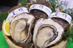 Tottori’s rock oysters, caught as-is by free diving, can reach lengths of u...