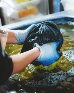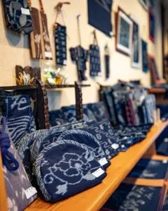 A woman-owned indigo dyeing studio in Chizu Town. The clear indigo color pr...