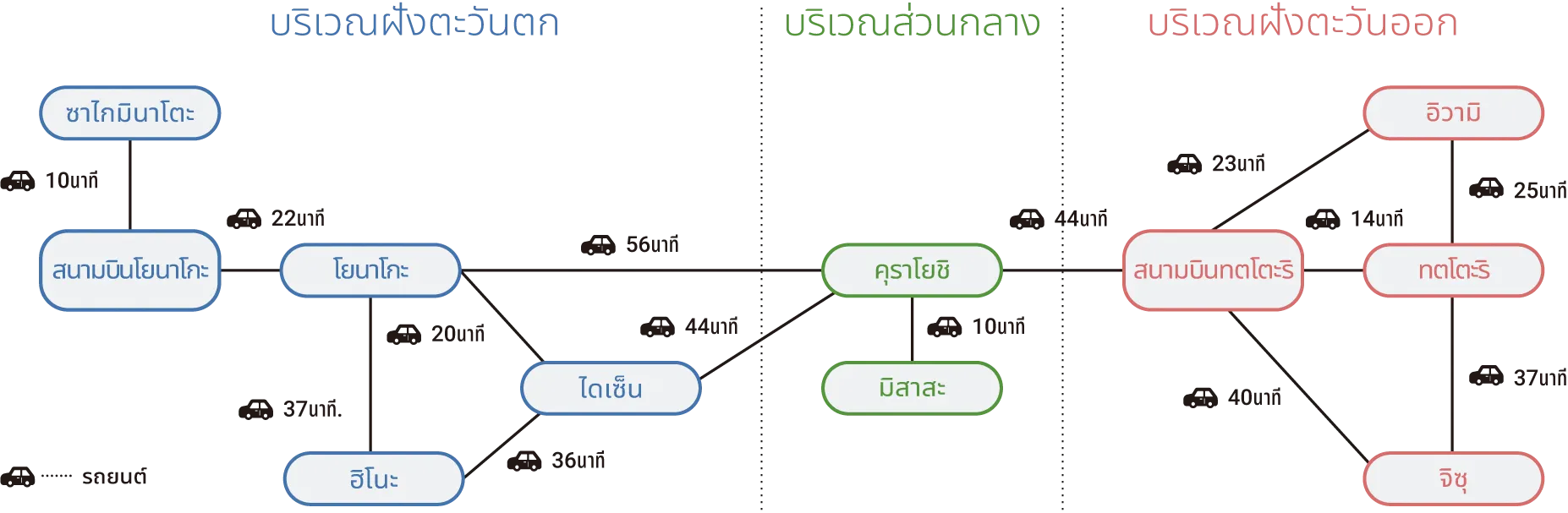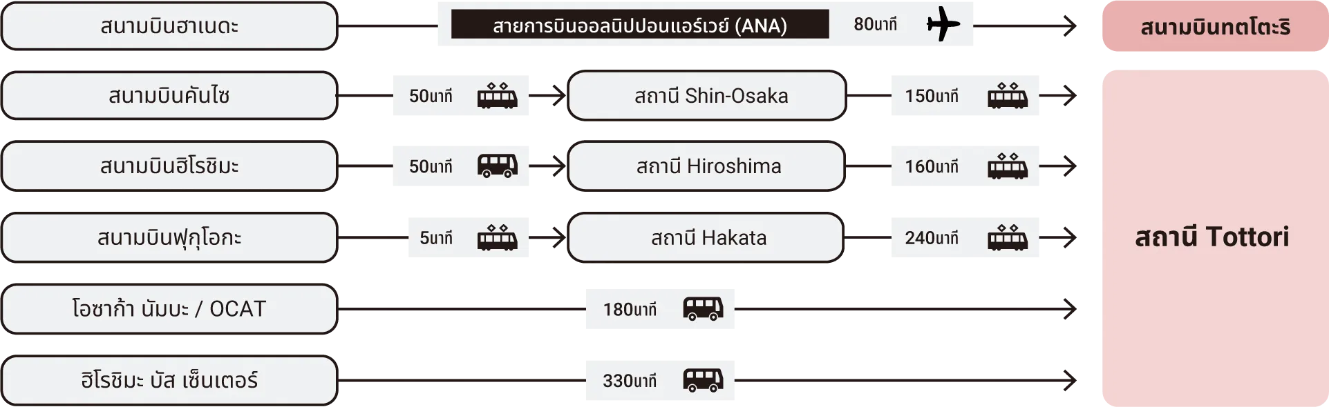 จังหวัดทตโตะริสามารถเดินทางได้จากหลายเมืองใหญ่และสนามบินในญี่ปุ่น ดูแผนที่และชาร์ตในหน้านี้เพื่อเลือกวิธีการเดินทางไปยังทตโตะริและสถานที่ต่างๆได้เลย เรามีระยะเวลาการเดินทางเขียนไว้พร้อมแล้ว ช่วยให้ทุกคนได้วางแผนและจัดสรรเวลาให้ได้แพลนเที่ยวในทตโตะริที่ดีที่สุด!